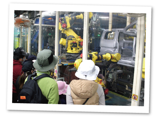 【工場見学コース】 ●ゲストホールで日産車体の紹介 ●工場見学(車体溶接工程 → 組立工程) ●保護具体験 ※ゲストホールと工場間は、弊社専用バスにて移動していただきます。 工場内は徒歩での移動と一部階段があり、バリアフリー対応ではありません。(全工程約500m) 詳しい見学の流れは『工場見学のご案内』をご覧ください。 【わくわくエコスクールコース】 ●地球温暖化について学ぼう ●モデルカーを使って実験(電気自動車について学ぼう) ●改善体験 ※工場内のライン見学はありません |